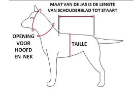 Eerst meet je de borstomvang. Deze meet je direct achter de voorpoten, daar waar de hond het breedste is. Meet dan helemaal rond de hond. De jas moet comfortabel zitten, het is belangrijk dat je hond wat beweegruimte heeft en daarom tel je er 1 a 2 cm bij. Een jas die past, maar waarin je hond zich niet kan bewegen is natuurlijk niet zo fijn voor je viervoeter.